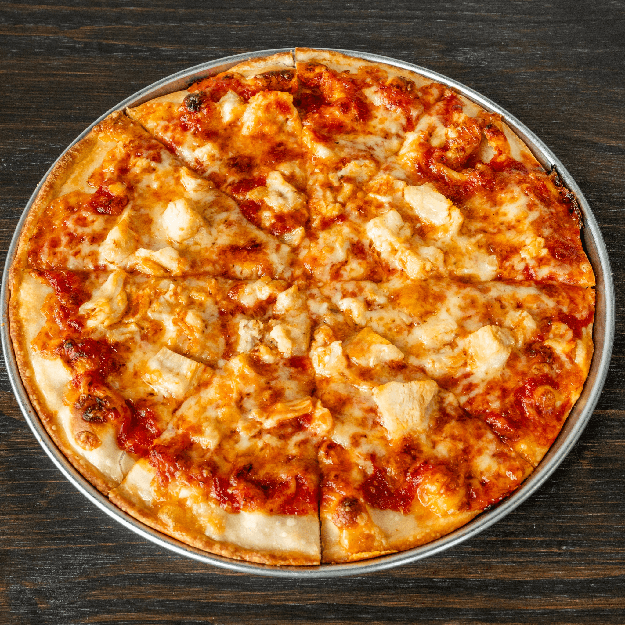 Our signature pizza topped with freshly chicken cutlet coated in Alfredo sauce with shredded cheese